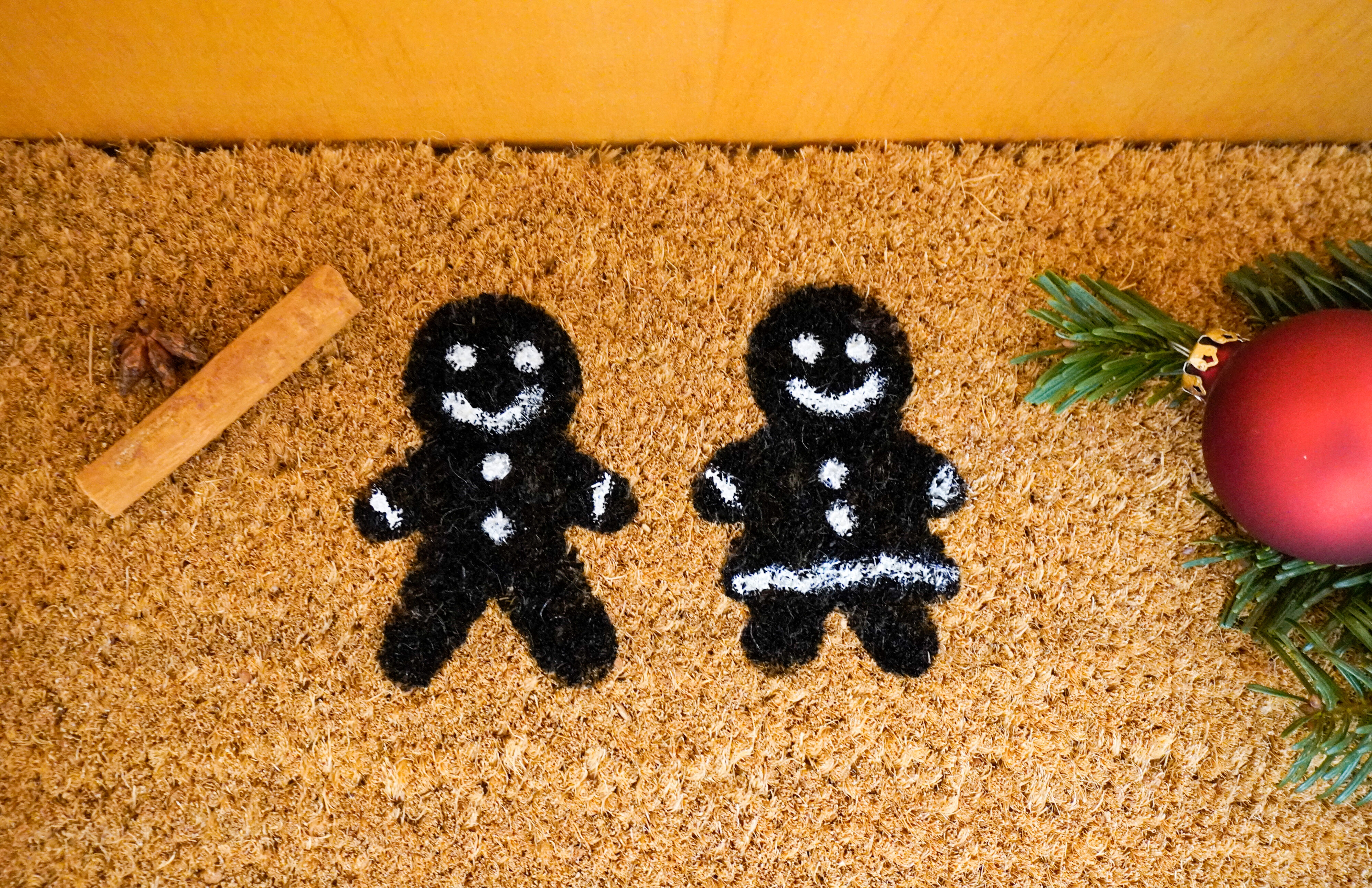 6. Ist die Fußmatte trocken, können Sie kleine Korrekturen mit dem Edding vornehmen. Zum Schluss können Sie noch kleine Feinheiten, wie die Gesichter und Kleidung der Pfefferkuchenmännchen mit dem weißen Edding aufmalen.